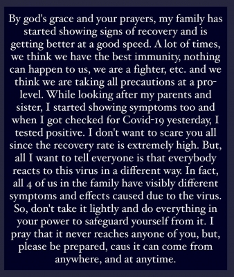 उन्होंने कहा, माता-पिता और बहन के बाद, मेरे अंदर भी कोरोना के लक्षण विकसित होने लगे, जिसके बाद कल मैंने कोरोना जांच करवाया, जिसमें मैं पॉजिटिव पाया गया हूं। मैं जरा भी नहीं डरा हूं, क्योंकि रिकवरी रेट काफी ज्यादा है। लेकिन मैं आप सब को बताना चाहता हूं कि इस वायरस को हर कोई अपने हिसाब से लेता है। मैं इस वायरस को हल्के में नहीं लेता हूं। मैं प्रार्थना करता हूं कि यह आप में से किसी के पास न पहुंचे।