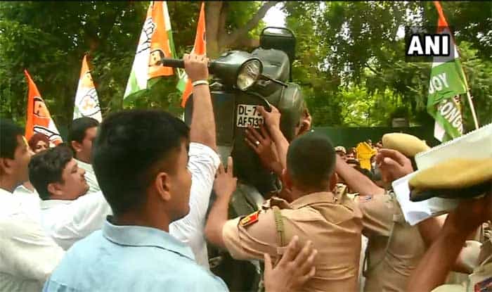 देश में संशोधित मोटर यान कानून के तहत यातायात नियमों का उल्लंघन करने पर भारी जुर्माने के खिलाफ बुधवार को दिल्ली में केंद्रीय मंत्री नितिन गडकरी के निवास के सामने